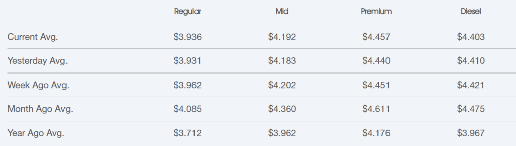 Table of average fuel prices for Regular, Mid, Premium, and Diesel comparing current, yesterday, one week ago, one month ago, and one year ago.