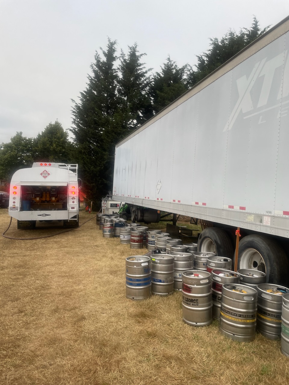 A Star Oilco fuel truck provides diesel delivery to a refrigerated trailer at an outdoor event ensuring cold storage for beer kegs and beverages